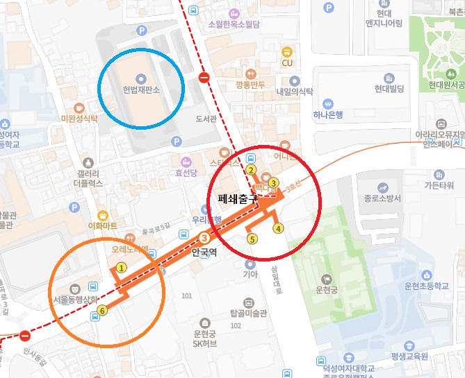 2~5번 출구는 모두 헌법재판소 근처 출구로, 현재 활발한 집회활동이 벌어지고 있습니다. 안국역 일부 폐쇄 출구는 아래와 같습니다.