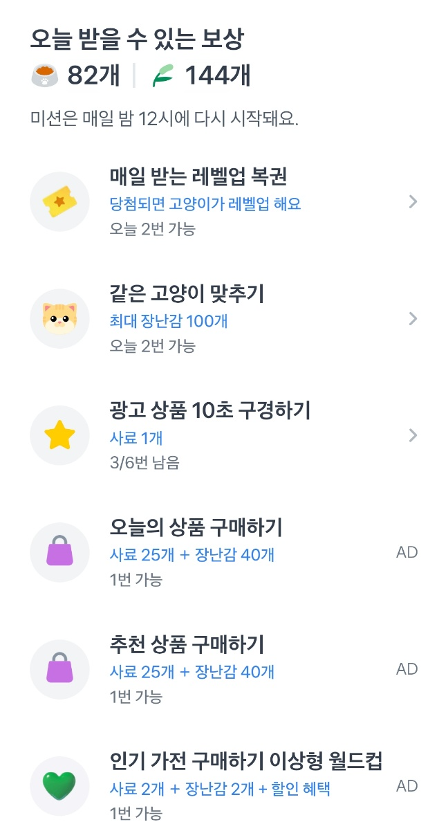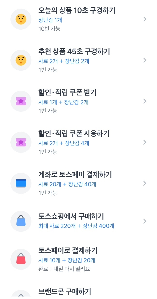 💜 아래 미션을 하면, 사료 장난감을 받을 수 있는데, 이중 몇몇 미션은 특별히 결제하지 않아도 항상 할 수 있으므로 매일 해주는 것이 좋습니다. 또 토스페이를 이용하신다면 하루에 한 번씩은 결제 시 토스페이를 이용하시면 사료 10개, 장난감 20개씩 받을 수 있습니다.