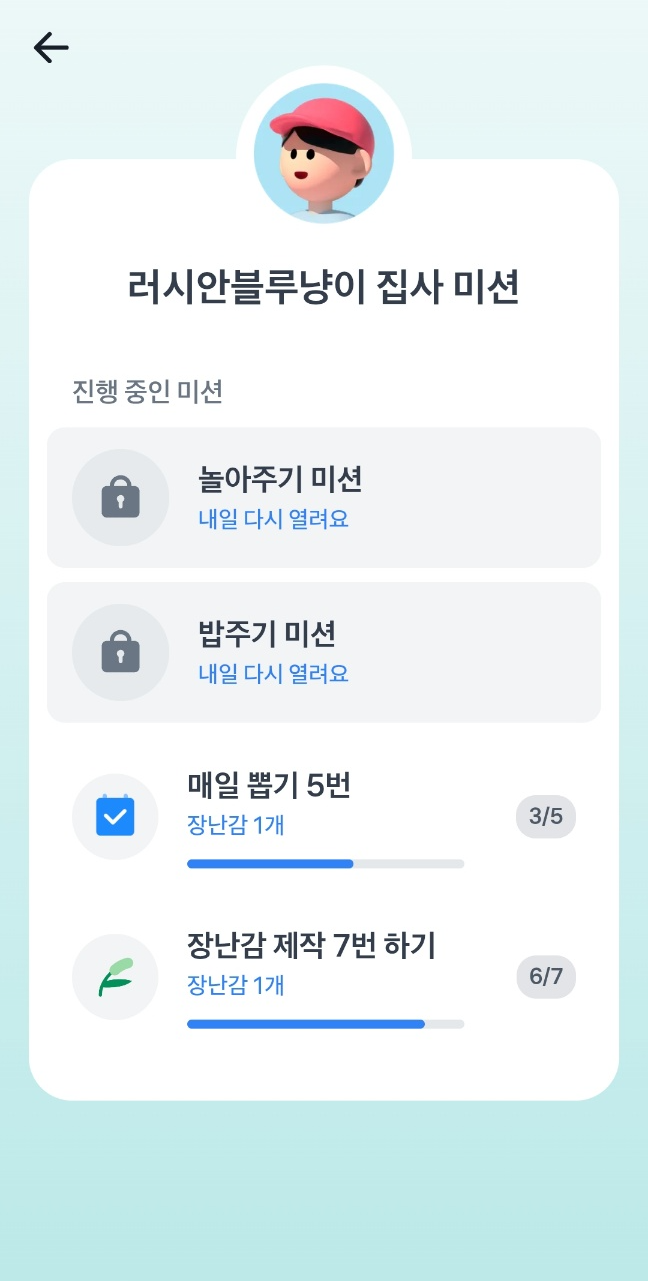 매일 출석체크와 미션을 통해 사료와 장난감을 받을 수 있습니다.