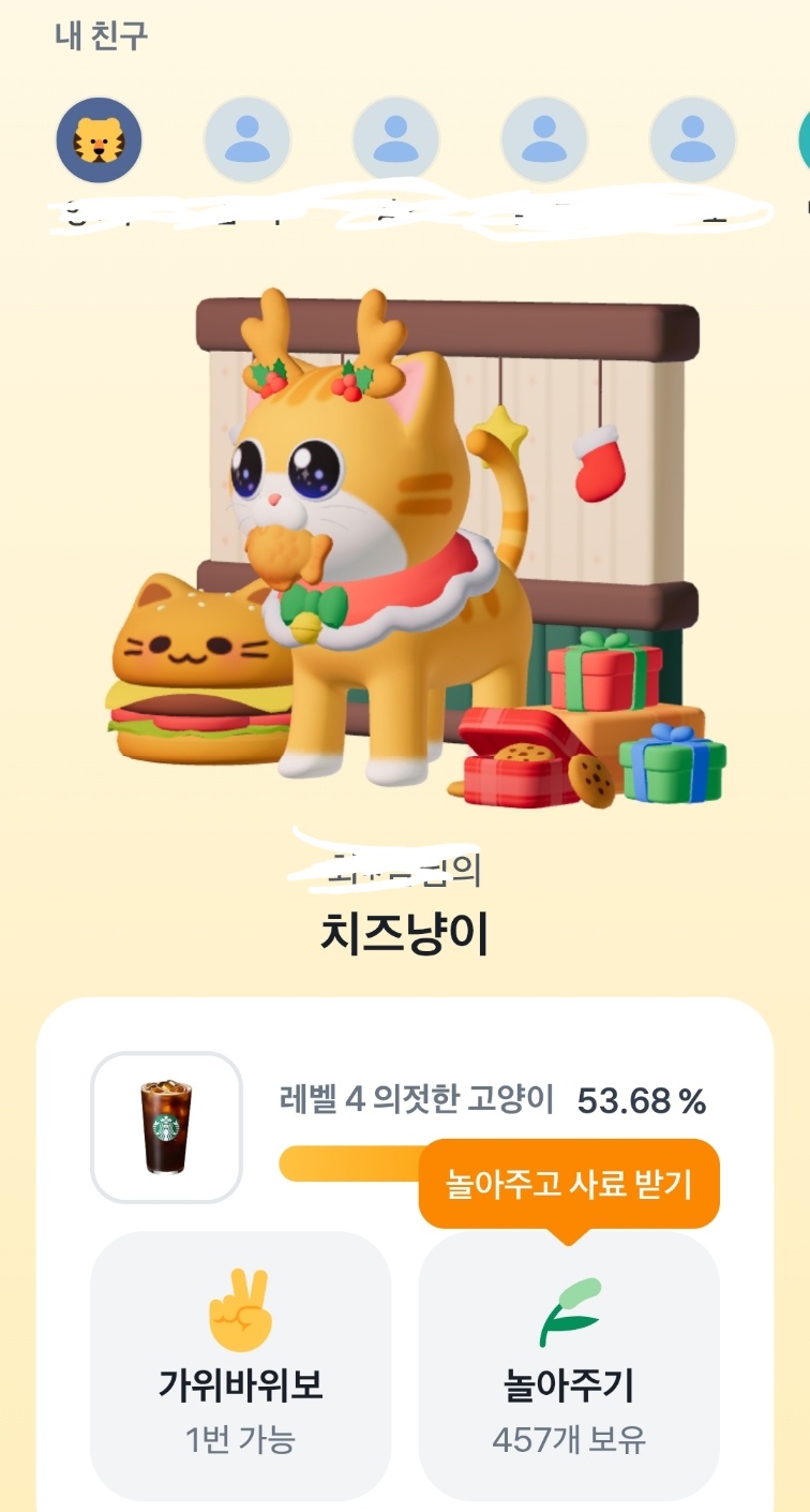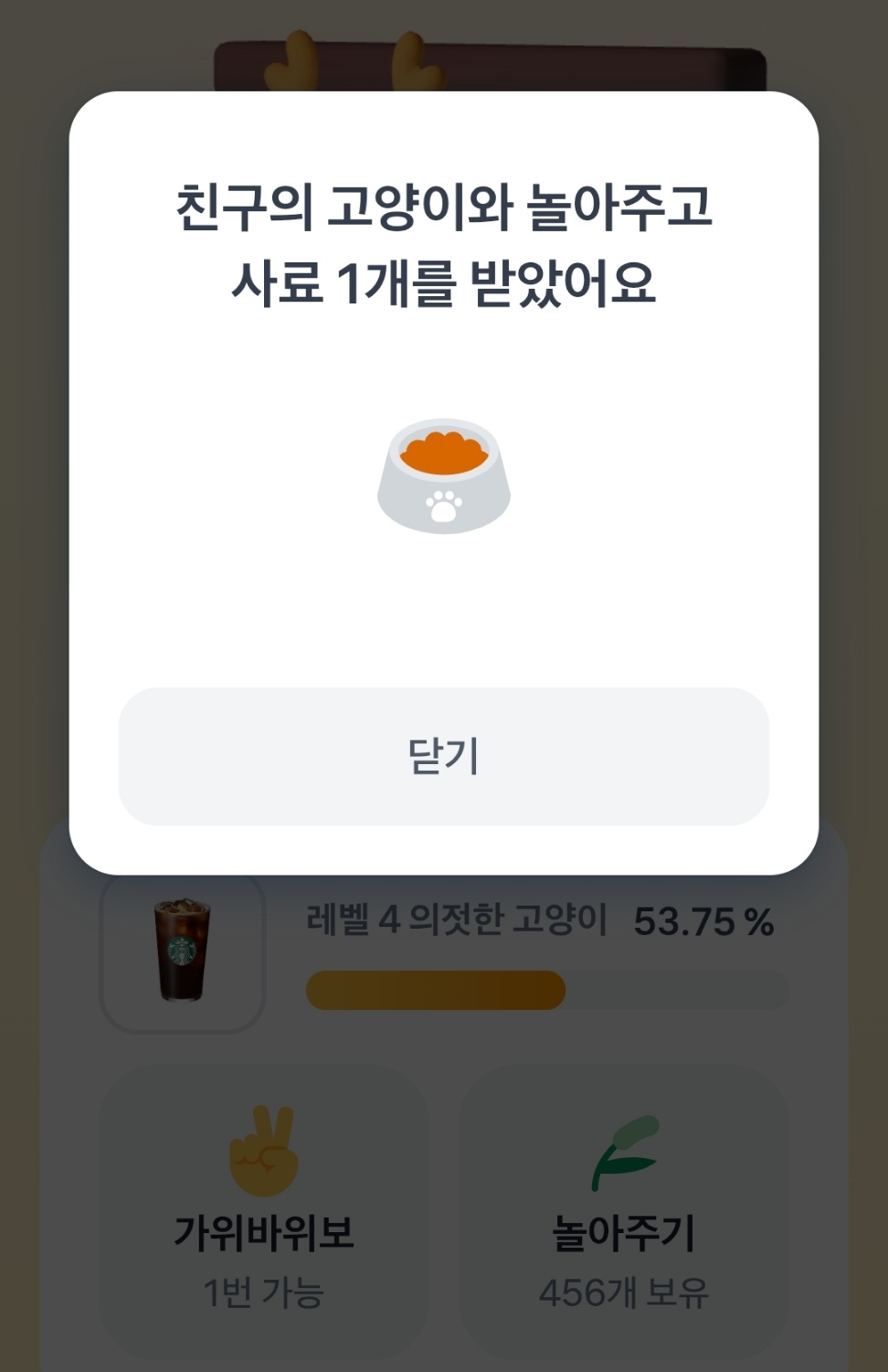 처음에 분양하면 고양이 레벨이 1이고, 고양이 레벨이 4가 된 이후 경험치가 100%가 되면, 기프티콘을 받을 수 있습니다.